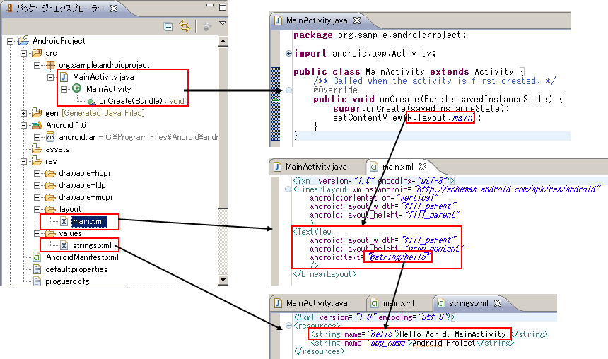 - genフォルダに、同じパッケージのR.javaがある。これは、勝手に生成される(おそらく、main.xml等を変えると自動生成?)